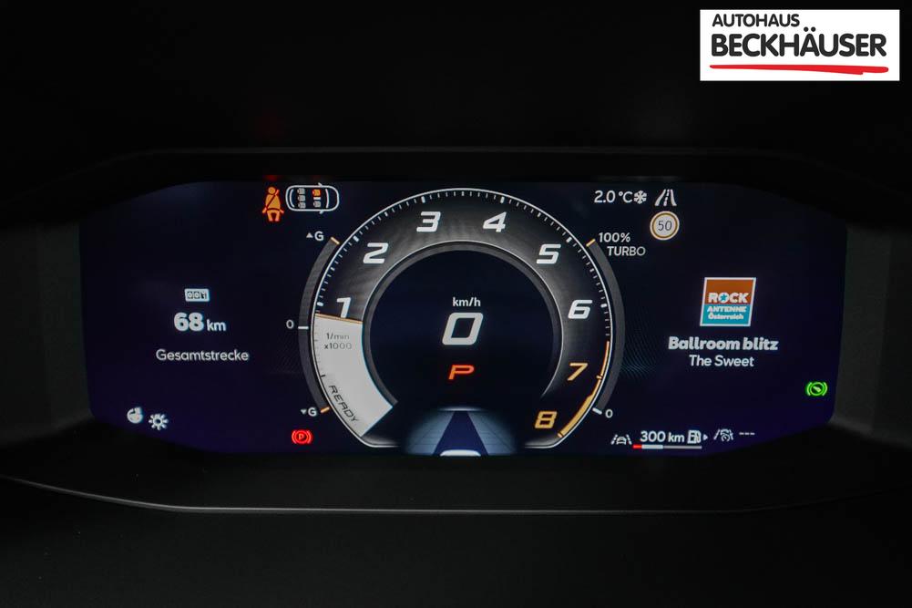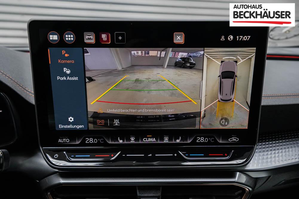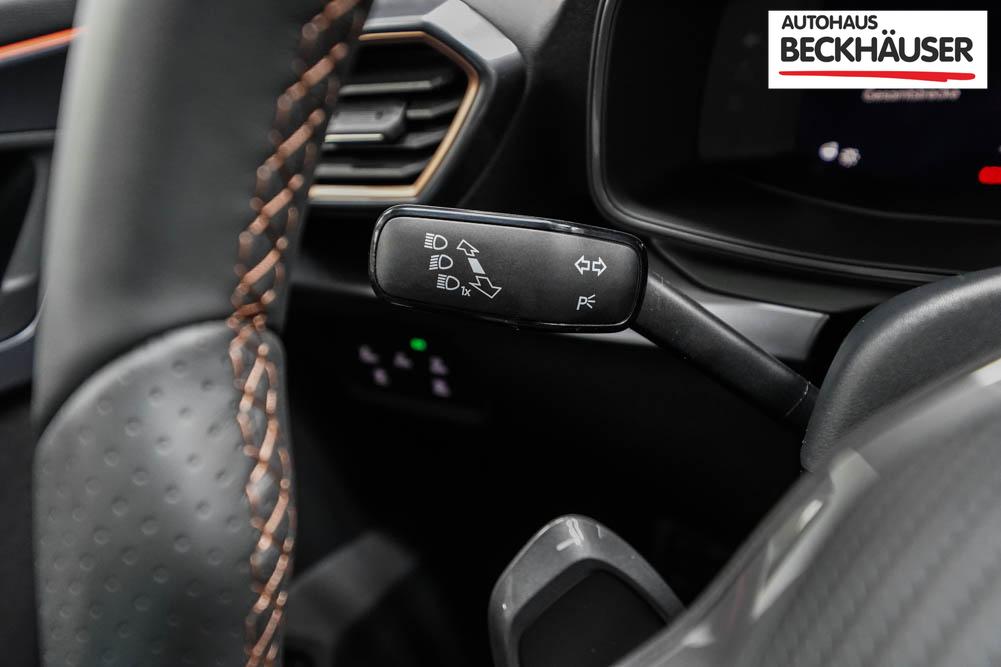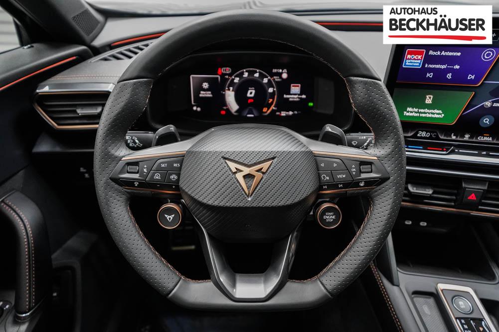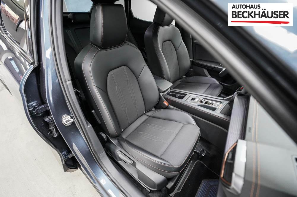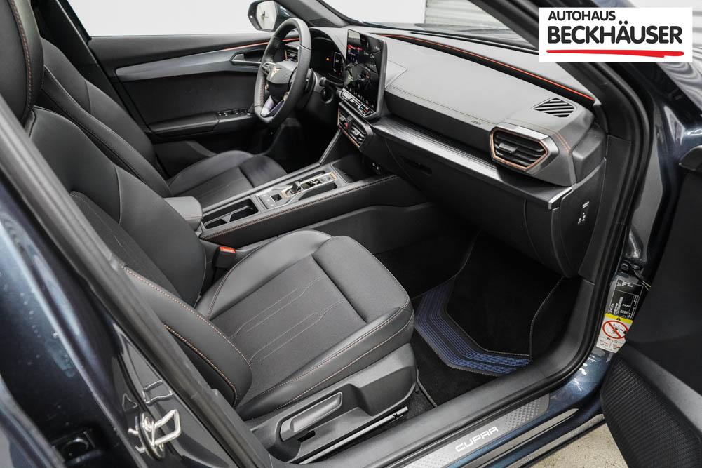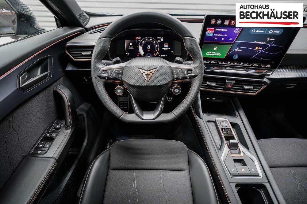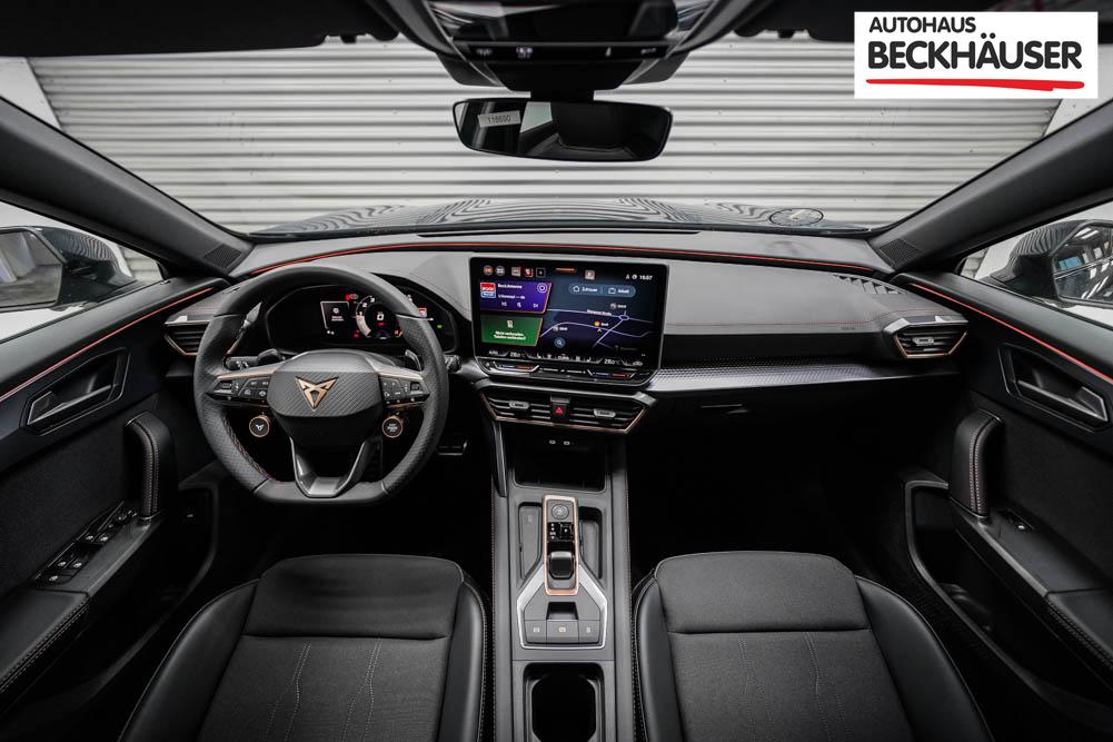 Beifahrersitz höhenverstellbar, Fahrersitz höhenverstellbar, Lederlenkrad, Lendenwirbelstütze, Mittelarmlehne vorne, Sitzbezug Stoff, Sportsitze, Gepäckraumabdeckung, geteilt umklappbare Rücksitzlehne, Lenkrad höhenverstellbar, Smart Wraparound Interieur Light, Beheizbares Lenkrad, Multifunktionslenkrad mit Satellitentasten, Isofix, Isofix Beifahrersitz, abgedunkelte Scheiben, 19 Zoll Alufelgen Sandstorm, Dachreling schwarz, ABS, Alarmanlage, Außenspiegel elektrisch, Fensterheber elektrisch, Kopfairbags, Nebelscheinwerfer, Seitenairbags, Servolenkung, Sitzheizung, DCC, ESP, Wegfahrsperre, Außenspiegel beheizbar, Beifahrerairbag, Fahrerairbag, Parkpilot hinten, Parkpilot vorne, Reifendruckkontrolle, Regensensor, Lichtsensor, Digital Cockpit, Tempomat Abstand ACC, Spurhalteassistent plus, Totwinkelassistent, Verkehrszeichenerkennung, Cupra HD Matrix LED Ultra Scheinwerfer, Tagfahrlicht, Pannenset, Rückfahrkamera, Intelligent Park-Assistent, Elektrische Heckklappe inkl. Virtual Pedal, KeylessEntry, StartStopSystem, Innenspiegel automatisch abbl., Müdigkeitswarnsystem, Notrufsystem, Schaltwippen, Klimaautomatik 3-Zonen, 360-Grad-Kamera, Geschwindigkeitsbegrenzer, Android Auto, Apple Carplay, Freisprecheinrichtung, Induktionsladestation, Sprachsteuerung, USB, Radio DAB, Bluetooth, Bordcomputer, Radio-Navigationssystem, Full Link, Cupra Full Link, variabler Ladeboden, erweiterte Herstellergarantie 5 Jahre/100.000km, Exit Assist, Stauassistent, Pre-Crash,
